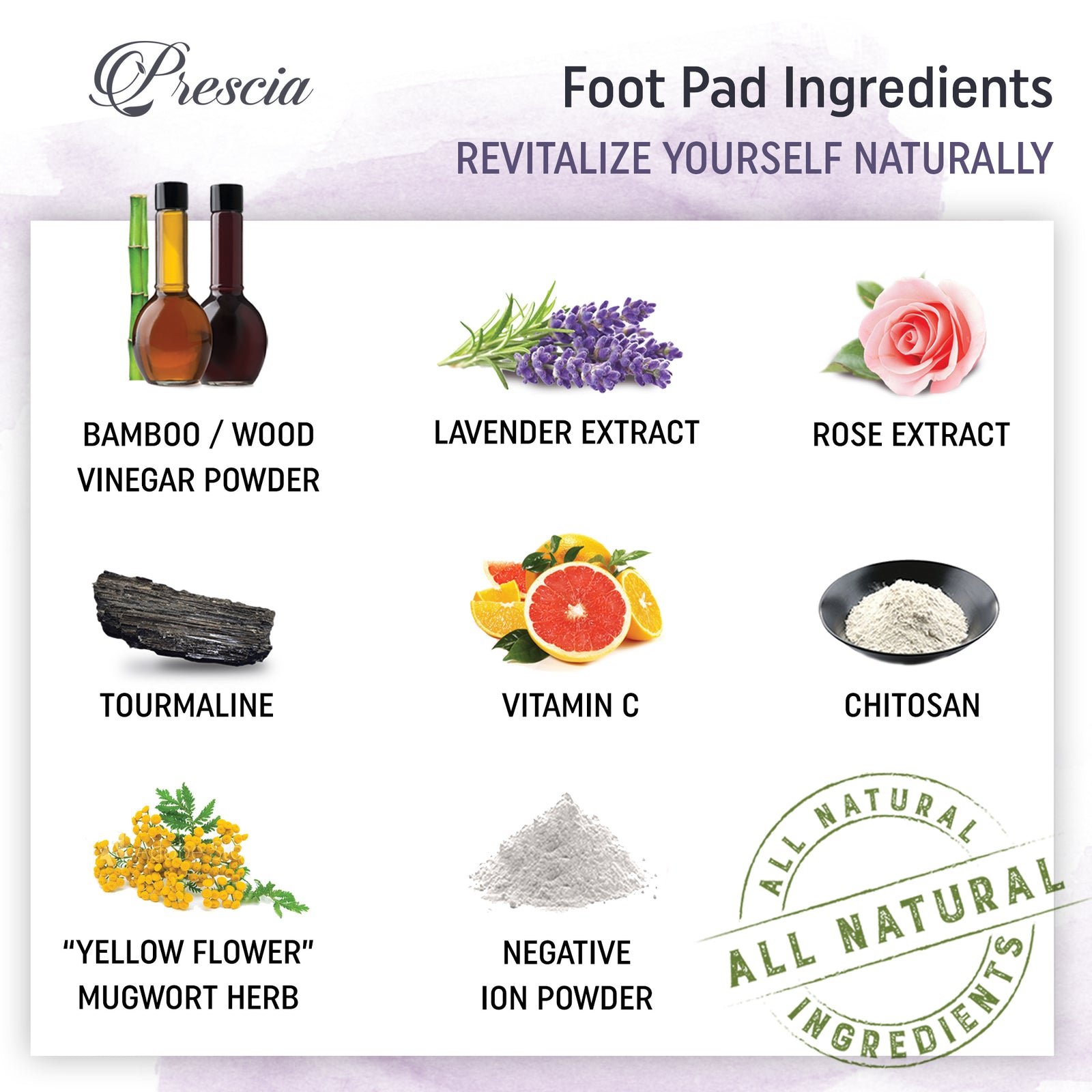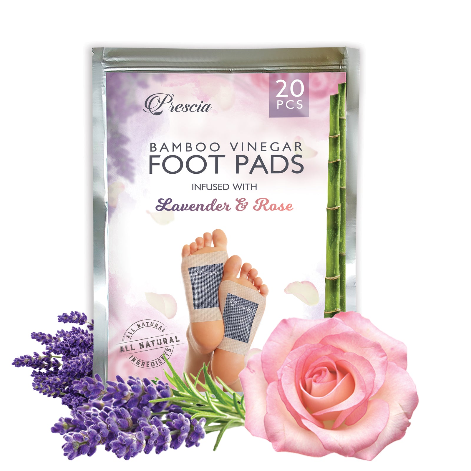 Prescia Detox Foot Pads are crafted with a blend of natural ingredients. Key components include bamboo vinegar, which is believed to have purifying properties, and tourmaline, a mineral thought to emit far-infrared energy may promote warmth and comfort. The pads also feature lavender and rose extracts, known for their calming aromas, potentially aiding in stress relief and sleep quality. Additional ingredients like chitin and vitamin C are included for their reputed skin-supporting benefits.